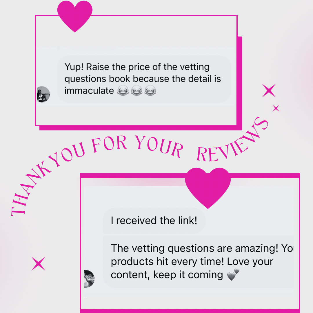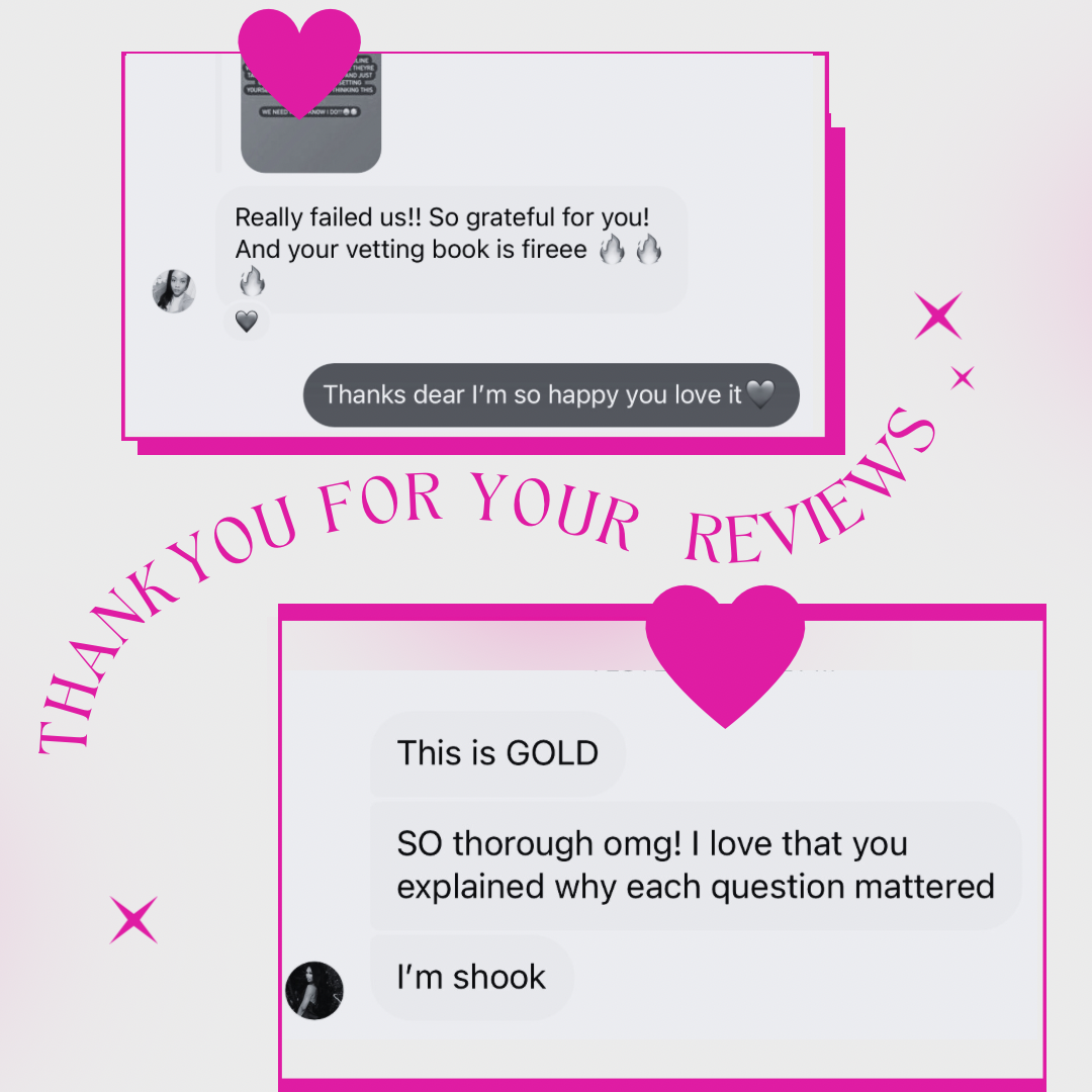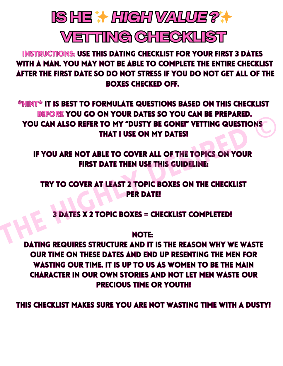 This quick and easy checklist will be your go-to for identifying HIGH VALUE PROVIDER MEN. This tool sets the standard for those seeking exceptional partners and want to be sure they are choosing the right suitors! Use this tool after you have asked your vetting questions to be sure you are pacing yourself correctly through the vetting process.