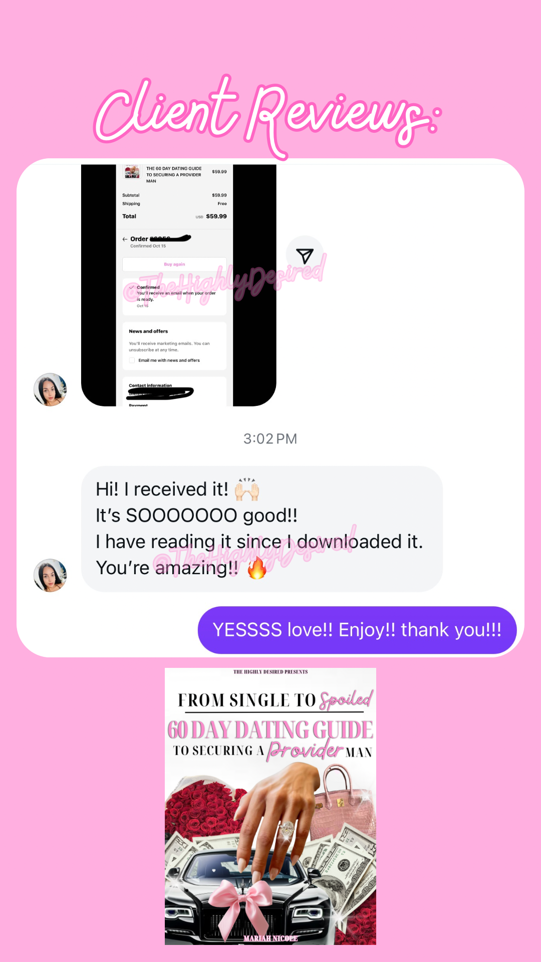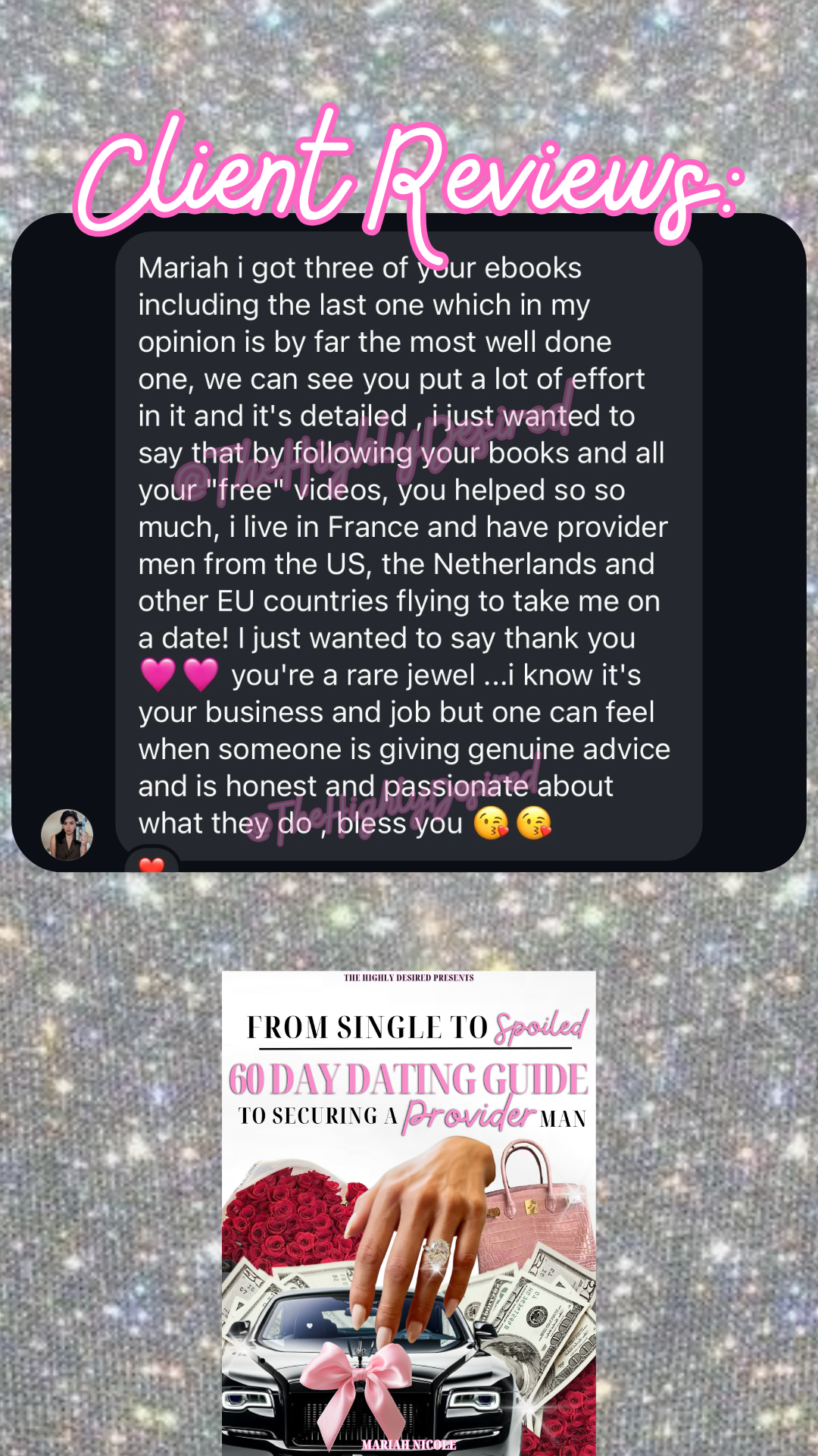 ✨ If you’re ready to date with intention, inspire generous provision, and secure genuine commitment in 60 days or LESS, this ebook is your roadmap. Whether you’re dating casually or looking to level up your current relationship, this 60 day guide to securing a provider gives you the EXACT strategies to achieve the luxury lifestyle and love you deserve 🤍